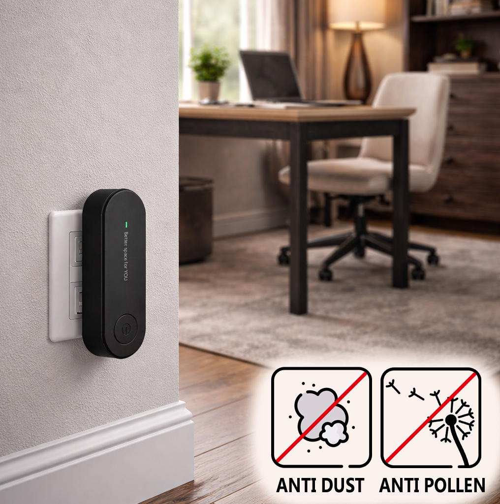 PUREAIR is a compact, plug-in negative ion air purifier designed to gently freshen indoor air and help reduce airborne particles such as dust and pollen. It operates silently and does not use filters or chemicals.